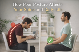 How Poor Posture Affects Your Spine and Daily Life Galat posture sirf back pain hi nahi, balki neck pain, shoulder stiffness aur fatigue ka bhi